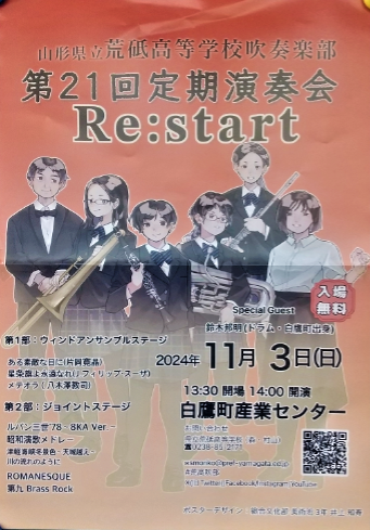 第21回吹奏楽部定期演奏会が11月3日(日)に開催されます。会場は白鷹町産業センター。少ない人数ながら心を一つに多くの楽曲に取り組んでいます。ぜひお越しください。(下の写真は吹奏楽部のXより) ポスターはこちらからご覧ください。(制作は美術部の井上智寿君)
